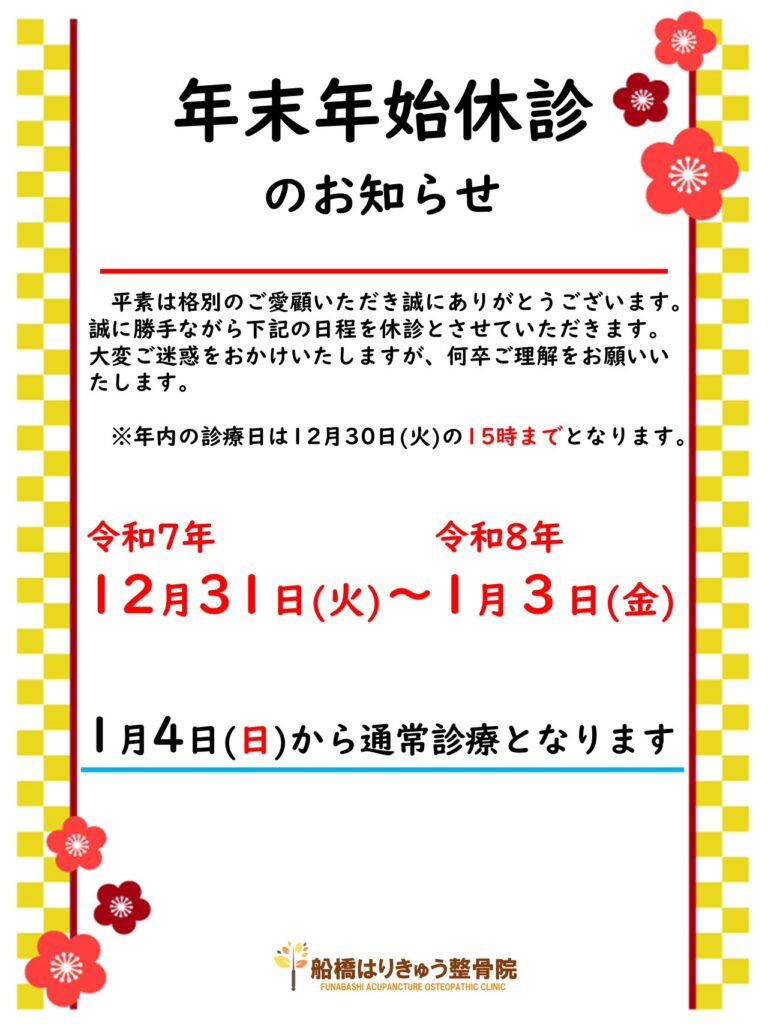 お知らせ 年末年始のご案内 【年末年始の休診情報】年内の診療は12/30(火) 15:00までとなります。12/31(日)~1/3(水)まで休診1/4(木)より診療となりますので、よろしくお願い申し上げます。